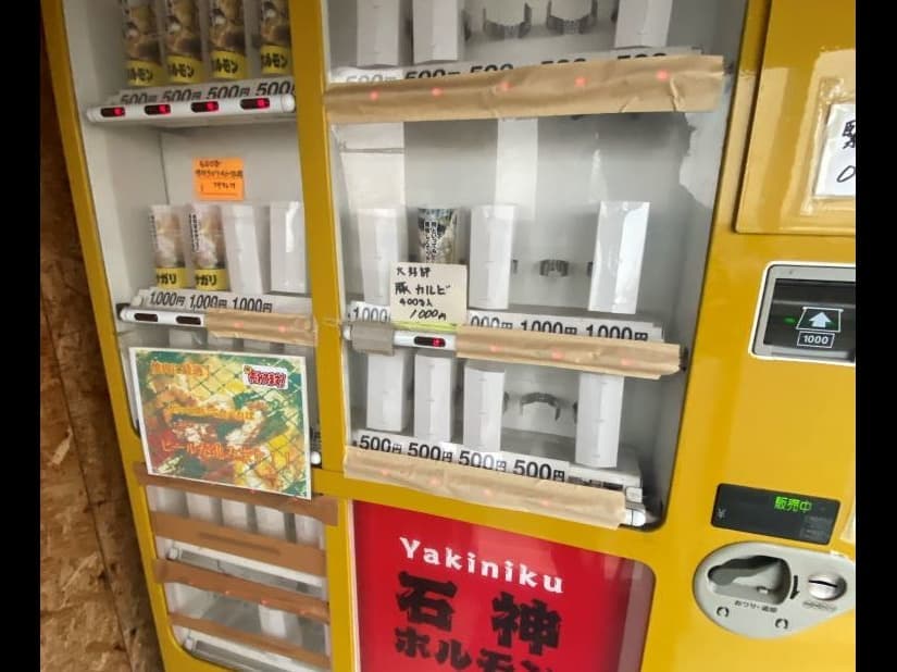 下の写真は近くの道の駅「もりた」の脇の道から見た五能線を挟んでの岩木山と、その道の駅の近くにある石神ホルモン店、ホルモンの自動販売機に魅せられました。