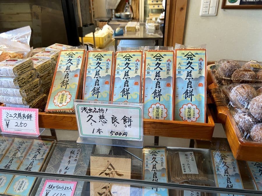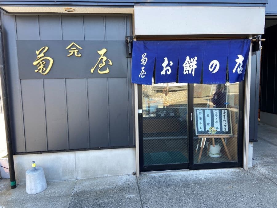 まずは道の駅近くの菊屋餅店さんで名物の 「久慈良(くじら)餅」(小豆やもち米、うるち米を練り合わせ、クルミをまぶして蒸した和菓子、「久慈良」は「いく久しく慈しまれる良い餅」の意とか)を。