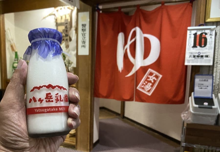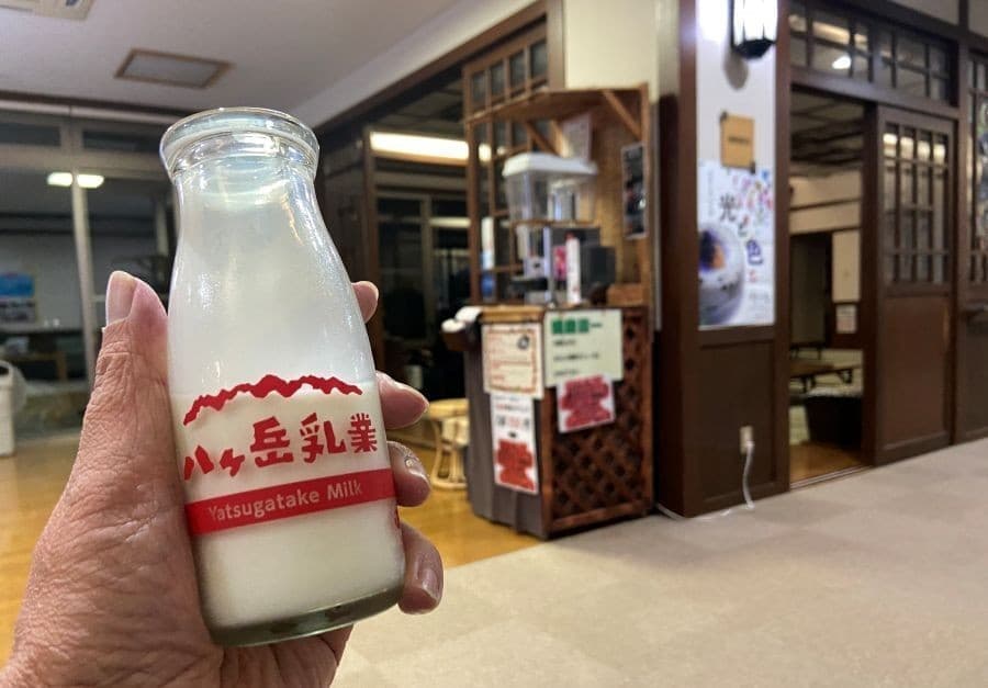 熱めの湯にさっと浸かり、湯上りに八ヶ岳牛乳をいただく。これが長距離ドライブの気分転換に良く効きます。